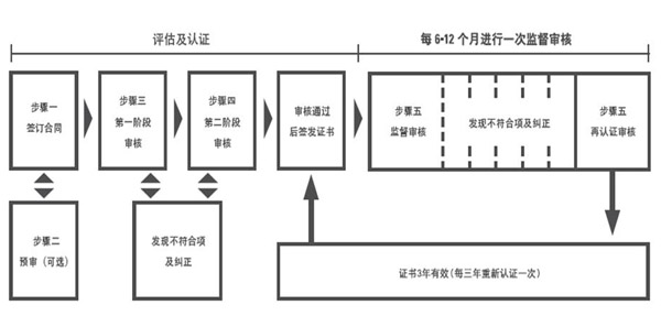 (4)通過認證或改正:第三方認證審核機構(gòu)對受審核方的符合性,以及對不符合方面的整改進行驗證,最后,認證機構(gòu)作出通過認證的決定。